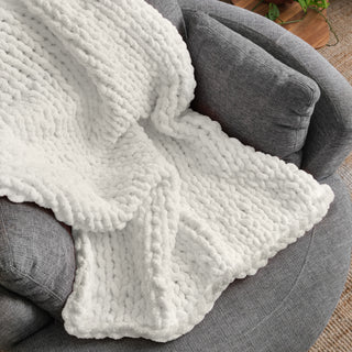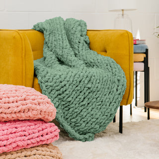 Your finished blanket? A cosy 1.7m x 1.1m and a satisfying 2kg of squish. To keep shipping costs down for you, we send the yarn vacuum-packed—don’t worry, it fluffs up beautifully!